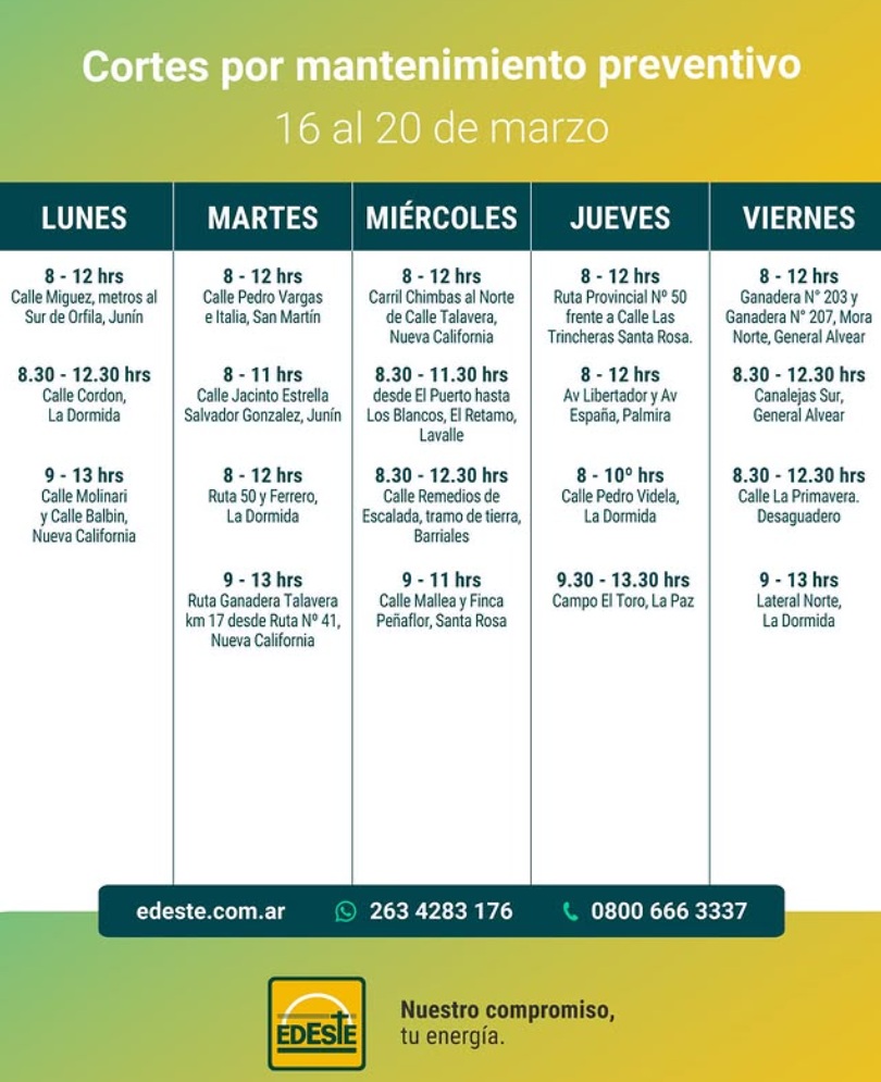 Edeste informó los cortes programados por mantenimiento preventivo que realizarán desde el lunes 16 al viernes 20 de marzo. Los mismos alcanzarán zonas de San Martín, Santa Rosa, Junín y La Paz.