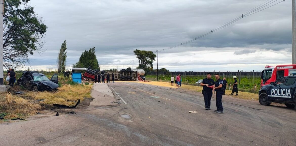 El accidente ocurrió este miércoles por la mañana en la intersección de Carril Chimbas y Cereceto. Un camión volcó tras ser impactado por un auto y colisionó contra un vehículo estacionado.