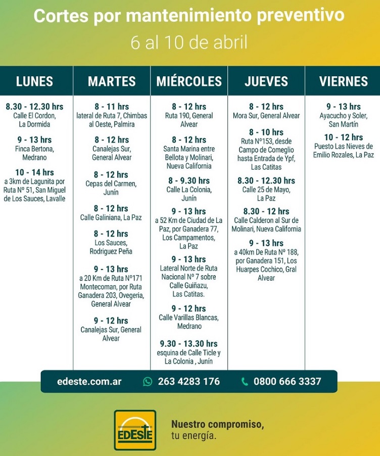 Edeste informó los cortes programados por mantenimiento preventivo que realizarán desde el lunes 6 al viernes 10 de abril. Los mismos alcanzarán zonas de San Martín, Santa Rosa, Junín y La Paz.