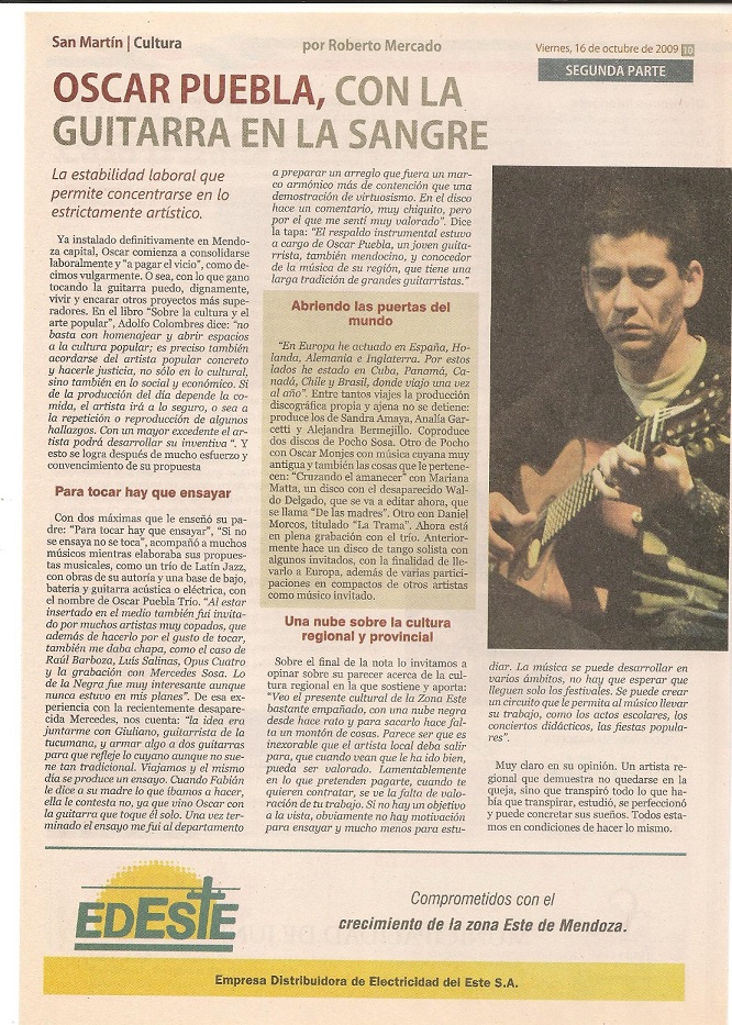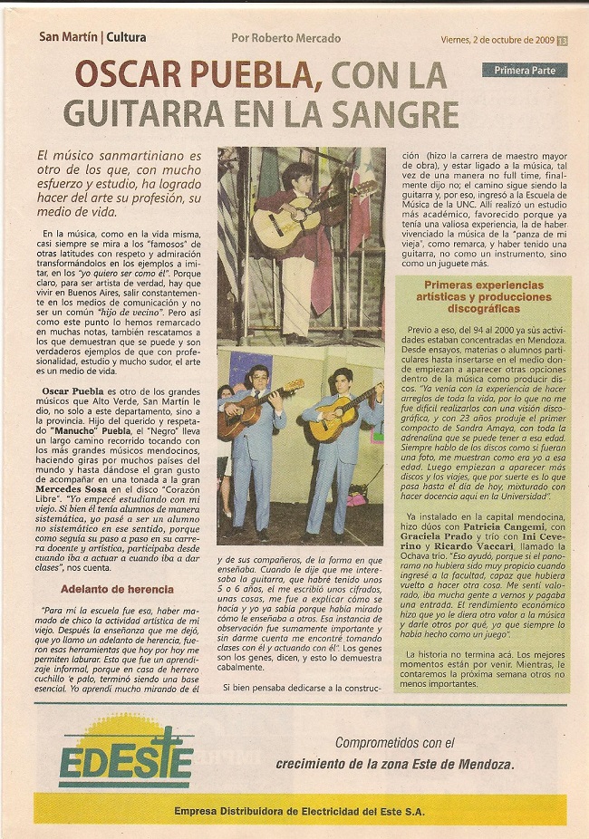 Con la partida de este plano de Oscar Puebla, la cultura de Mendoza pierde a otro de los más extraordinarios guitarristas que supo concebir. Nacido en el distrito de Alto Verde, departamento de General San Martín, supo ganarse un lugar destacado en el ambiente artístico a puro talento y profesionalismo.