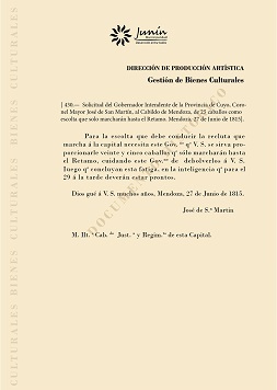 En el marco de un proyecto de la Dirección de Producción Artística, que tiene como objetivo la reconstrucción histórica y patrimonial de las “Memorias del Libertador” en su gesta política, militar, económica, social y cultural y educativa, se presentó un nuevo documento con la firma del General Don José de San Martín, donde solicita al Cabildo de Mendoza “25 caballos que solo marcharan hasta el Retamo para la custodia de los reclutas que se dirigen camino a la capital”.