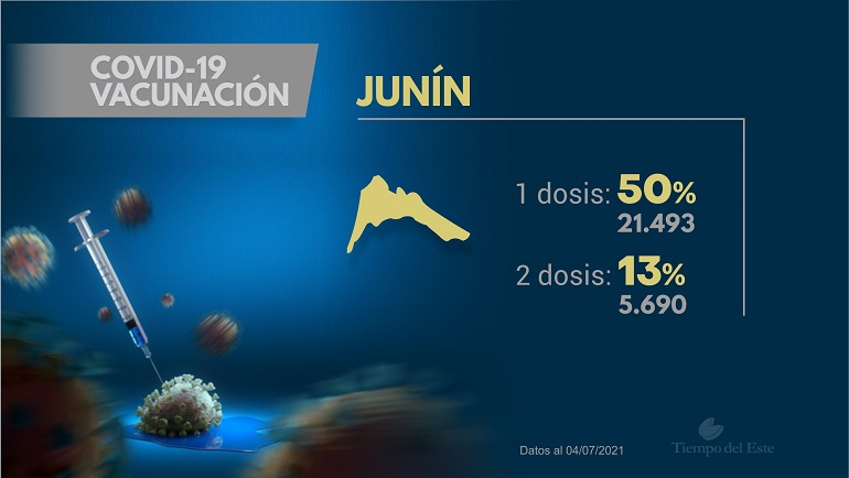 De acuerdo a datos correspondientes hasta el 4 de julio, 21.493 juninenses ya cuentan con la primera dosis de la inoculación, esto implica un 50% del total de la población. A su vez se aplicaron 5.690 segundas dosis (13%).