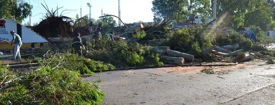 Los árboles -de más de cincuenta años- y cuyos troncos cuentan entre 2 a 4 metros de diámetro fueron “arrancados de raíz” por la fuerza del viento y se desplomaron sobre la avenida Del Libertador provocando la destrucción de parte del cierre perimetral del estadio. Además, el techo de chapa del buffet del club, voló varios metros y cayó en el medio de la avenida, más los cortes del tendido eléctrico sobre la arteria.