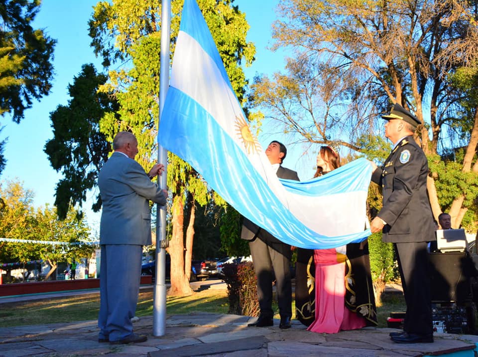 El intendente Miguel Ángel Ronco junto al vicegobernador Mario Abed, realizaron el izamiento del Pabellón Nacional en la plaza Bernardino Rivadavia, por el 138º Aniversario del departamento.