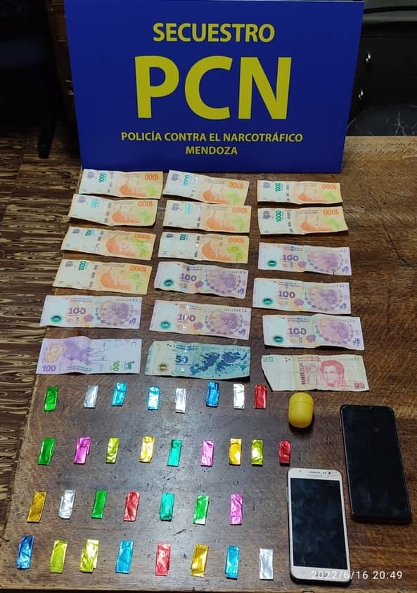 Según indicó el ministerio de Seguridad, los policías secuestraron “Treinta y tres (33) envoltorios de papel glasé, realizados en forma de raviol, de diferentes colores, conteniendo en su interior sustancia blanquecina en polvo, la que por su forma de conservación y modo de ocultamiento arroja positivo para cocaína, dinero en efectivo (billetes de baja denominación), y dos celulares”.