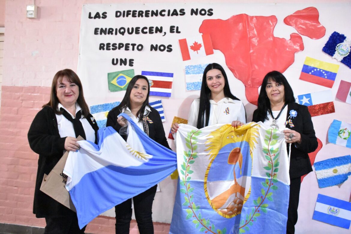 Los directivos de la escuela recibieron como obsequio banderas de ceremonia, que fueron entregadas por la Intendenta Flor Destéfanis y la Directora de Educación, Natalia Gago.