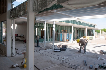 La empresa Wynne Industrial SRL, a cargo de las tareas, está en plena colocación de los pisos de granito en aulas y galerías, y de los aislantes de lana de vidrio en los muros del establecimiento. Además, comenzó a instalar cielorrasos suspendidos en el Salón de Usos Múltiples, entre otras intervenciones.