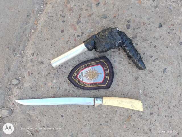 Al bajar a los dos sujetos del remis la policía los requisó y se encontró, entre las pertenencias del pasajero de 36 años, un cuchillo con una empuñadura plástica de aproximadamente 15 cm de largo y una réplica de tumbera tipo revólver de caño de metal blanco de 15 cm de largo. Los detenidos fueron trasladados al destacamento San Pedro junto con los objetos incautados.