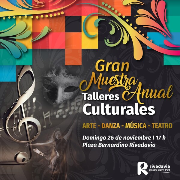 Este domingo, a partir de las 17 horas, en la plaza departamental Bernardino Rivadavia, se realizará la muestra de los talleres culturales de Rivadavia.