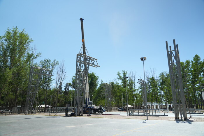 La municipalidad de Rivadavia informó que ya se colocaron las seis columnas que sostendrán el techo del nuevo polideportivo.