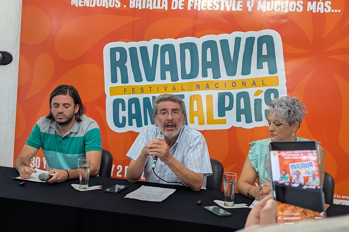 Este jueves, el intendente de Rivadavia, Ricardo Mansur, encabezó una conferencia de prensa donde se brindaron detalles sobre la 38º ediución del festival de Rivadavia Canta al País. Estuvo acompañado por la coordinadora de Cultura, Miriam Arboit; y por el secretario de Desarrollo Humano, Andrés Mansur.