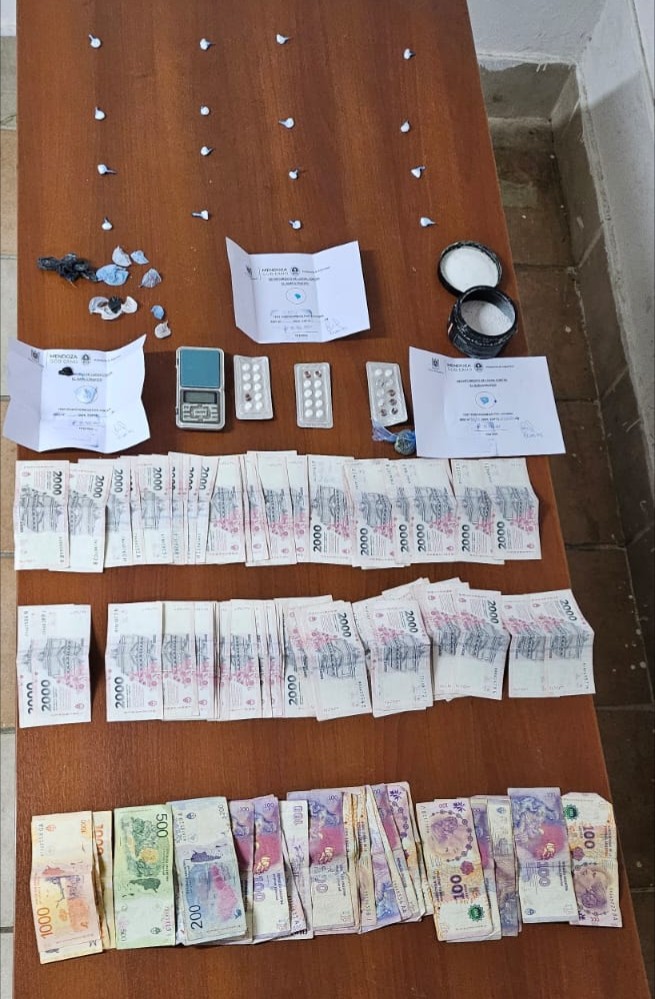 El allanamiento arrojó como resultado el secuestro de 16 envoltorios con 4,1 gramos de cocaína, otros tres con 1,88 gramos, restos de sustancia blanquecina, y un envoltorio con 0,51 gramos de marihuana. Además, los efectivos hallaron 29 gramos de sustancia granulada, tres blisters de pastillas, elementos de corte, una balanza digital sin pilas y $256.700 en efectivo.