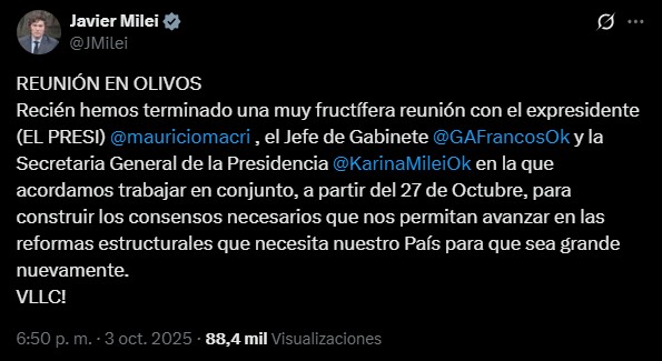Según expresó Milei en la red X, junto a Macri, el jefe de Gabinete Guillermo Francos y la secretaria general de la Presidencia, Karina Milei, acordaron “trabajar en conjunto, a partir del 27 de octubre, para construir los consensos necesarios que nos permitan avanzar en las reformas estructurales que necesita nuestro país para que sea grande nuevamente”.