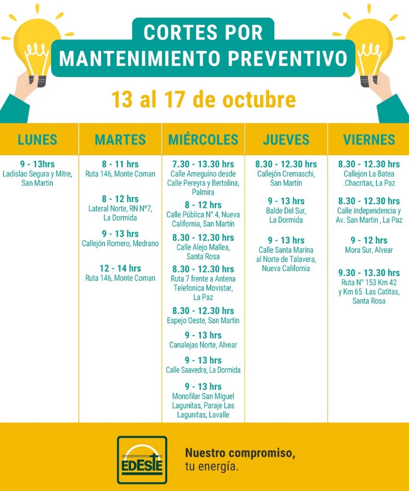 Edeste informó los cortes programados por mantenimiento preventivo que realizarán desde el lunes 13 al viernes 17 de octubre. Los mismos alcanzarán zonas de San Martín, Santa Rosa, Junín, y La Paz.