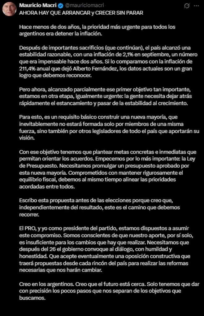 Este jueves, el expresidente Mauricio Macri le pidió al Gobierno que haga los esfuerzos para “construir una nueva mayoría”. El exmandatario recurrió a su cuenta de la red social X para anticiparse a lo que suceda después de las elecciones del 26 de octubre