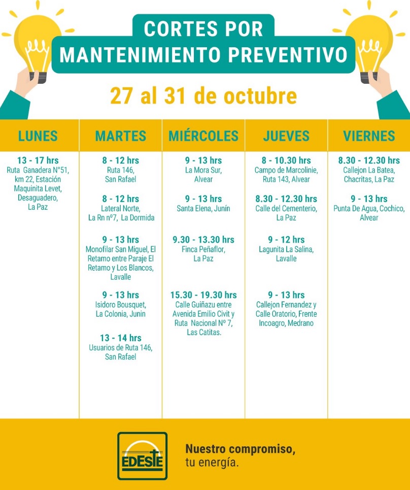Edeste informó los cortes programados por mantenimiento preventivo que realizarán desde el lunes 27 al viernes 31 de octubre. Los mismos alcanzarán zonas de Santa Rosa, Junín, y La Paz.