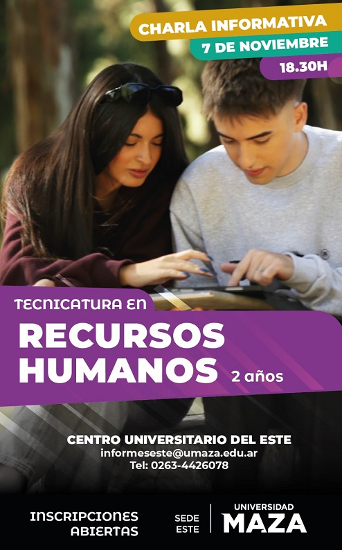 La Universidad Maza, sede Este, anunció una charla informativa sobre la Tecnicatura en Recursos Humanos, que se desarrollará el viernes 7 de noviembre a las 18.30 en el Centro Universitario del Este, en La Colonia.