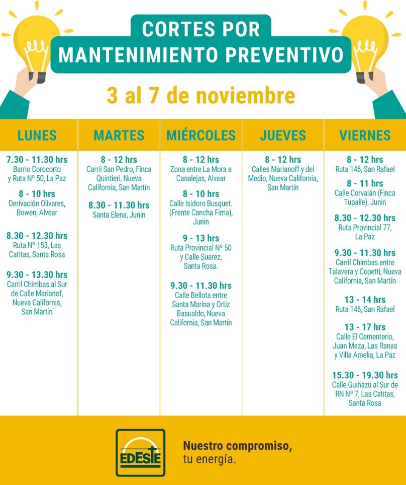 Edeste informó los cortes programados por mantenimiento preventivo que realizarán desde el lunes 3 al viernes 7 de noviembre. Los mismos alcanzarán zonas de San Martín, Santa Rosa, Junín, y La Paz.