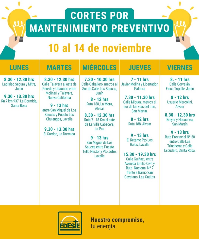 Edeste informó los cortes programados por mantenimiento preventivo que realizarán desde el lunes 10 al viernes 14 de noviembre. Los mismos alcanzarán zonas de San Martín, Santa Rosa, Junín, y La Paz.