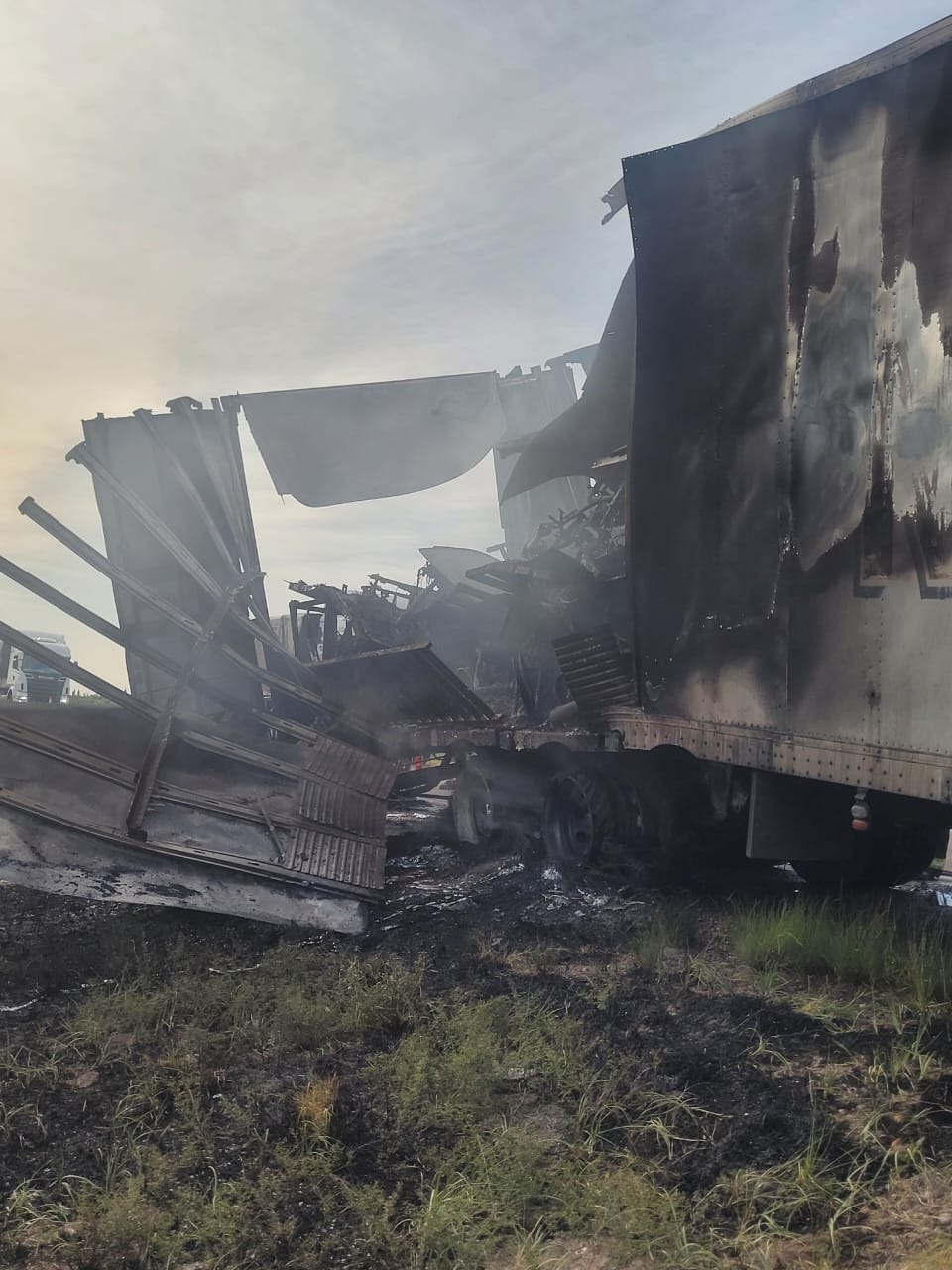 Un llamado al 911 alertó sobre el vehículo en llamas. Al llegar al lugar, los efectivos constataron que se trataba de un camión tractor con semirremolque que transportaba 83 motocicletas marca Corven, las cuales resultaron prácticamente incineradas por completo.