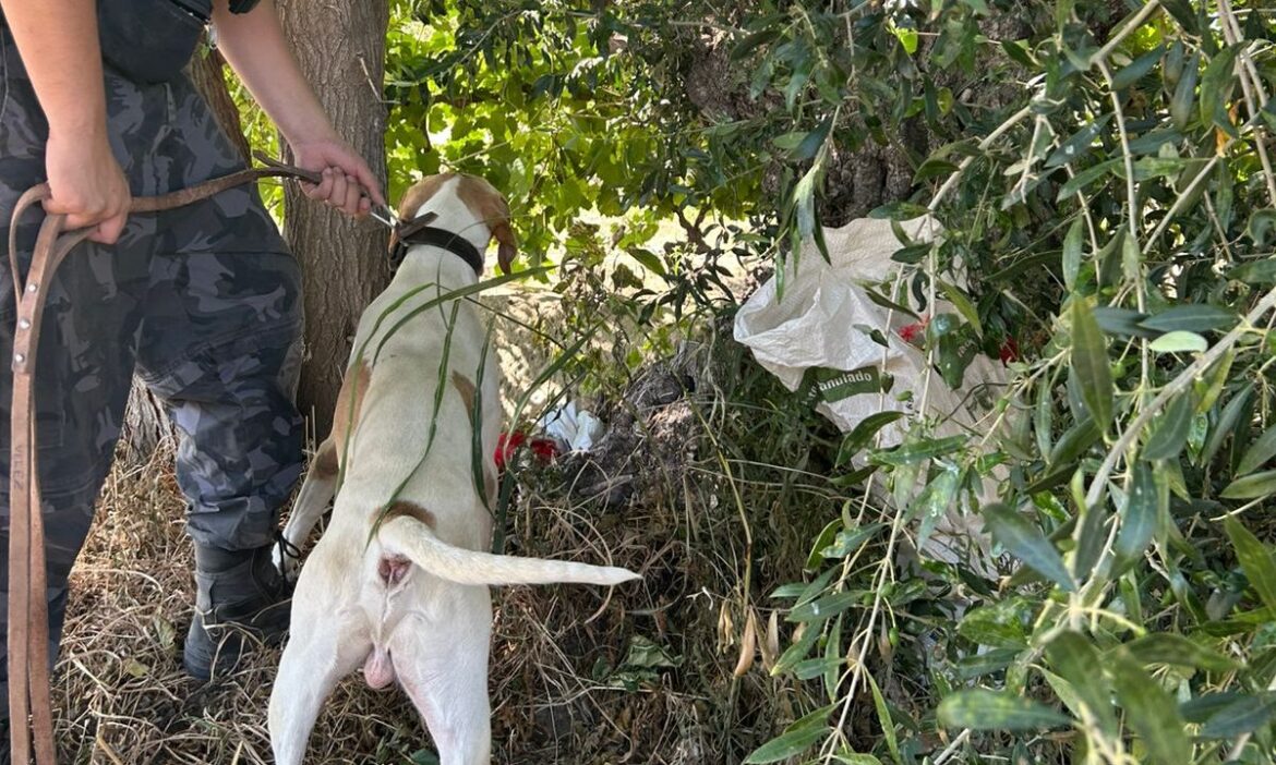Tras avanzar aproximadamente 150 metros, el ejemplar localizó un bidón de 20 litros y, a unos tres metros de este, tres bolsas de lona con fertilizante granulado, que formaban parte de los elementos robados.