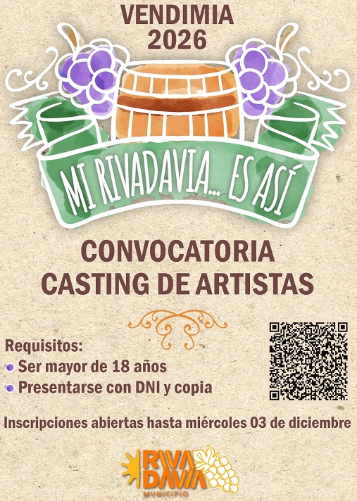 El Municipio lanzó oficialmente la convocatoria para el casting de artistas que formarán parte de la Vendimia 2026, bajo el concepto “Mi Rivadavia… es así”, una fiesta que buscará poner en escena identidad, historia, música y la esencia cultural del departamento. La inscripción ya está disponible y se extenderá hasta el miércoles 3 de diciembre.
