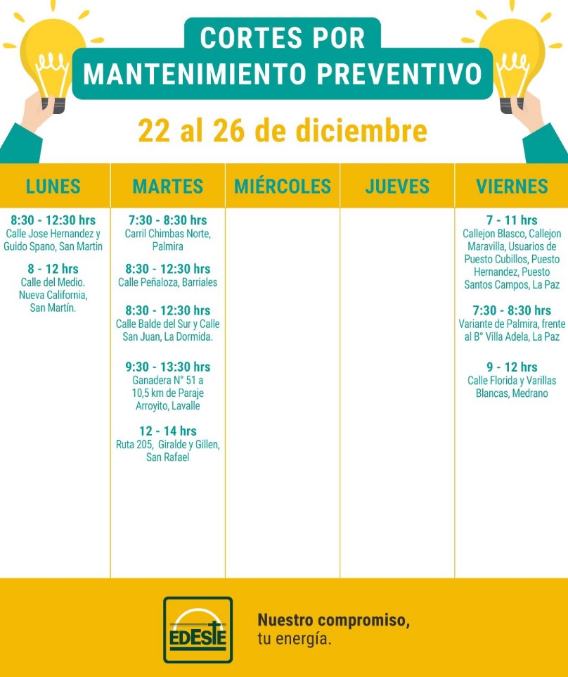 Edeste informó los cortes programados por mantenimiento preventivo que realizarán desde el lunes 22 al viernes 26 de diciembre. Los mismos alcanzarán zonas de San Martín, Santa Rosa, Junín, y La Paz.