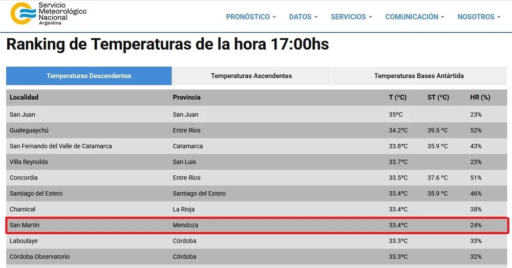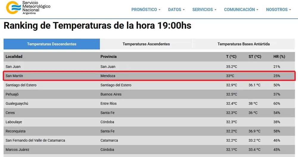 Según el ranking de temperaturas que elabora el Servicio Meteorológico Nacional, este martes a las 17 horas, el departamento de San Martín llegó a los 33.4°C y se ubicó en el octavo puesto. Para ese horario, la capital de San Juan se ubicaba en el top del ranking con 35°C.