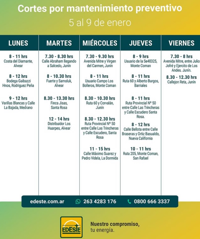 Edeste informó los cortes programados por mantenimiento preventivo que realizarán desde el lunes 5 al viernes 9 de enero. Los mismos alcanzarán zonas de San Martín, Santa Rosa y Junín.