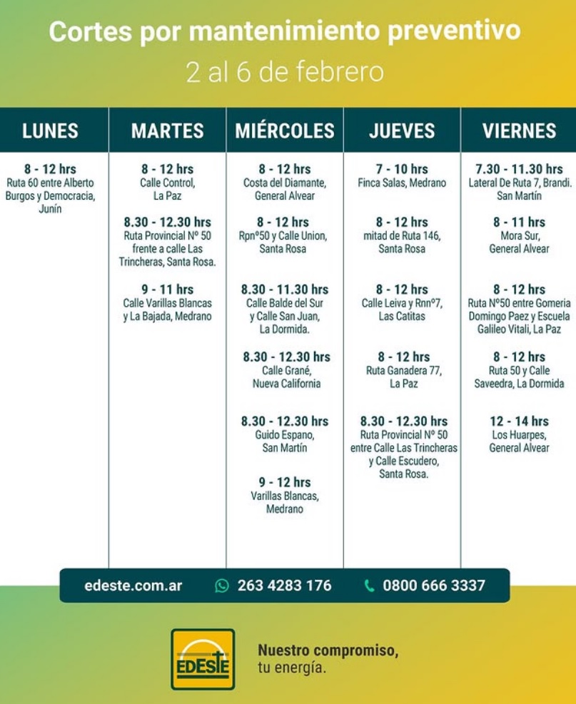 Edeste informó los cortes programados por mantenimiento preventivo que realizarán desde el lunes 2 al viernes 6 de febrero. Los mismos alcanzarán zonas de San Martín, Santa Rosa, Junín y La Paz.